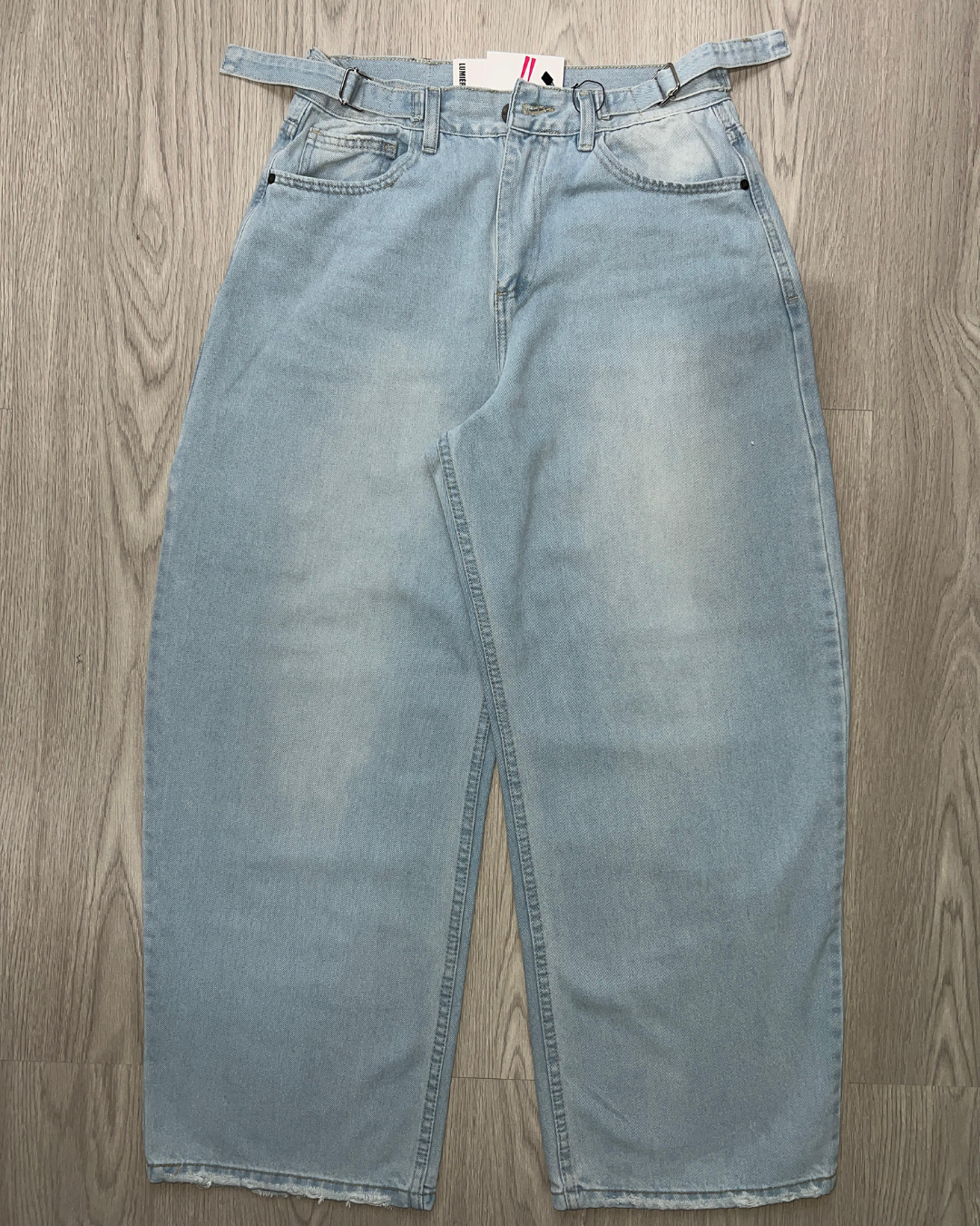 Este jeans baggy unisex está confeccionado en denim rígido 100% algodón, lo que le da una estructura firme y un look auténtico. Su silueta amplia ofrece comodidad y un estilo urbano contemporáneo. Cuenta con correas laterales ajustables en la cintura, ideales para adaptar el calce sin necesidad de cinturón. Presenta un lavado azul claro con leves desgastes que aportan un toque vintage. Es una prenda versátil, perfecta para quienes buscan un estilo relajado pero con carácter.