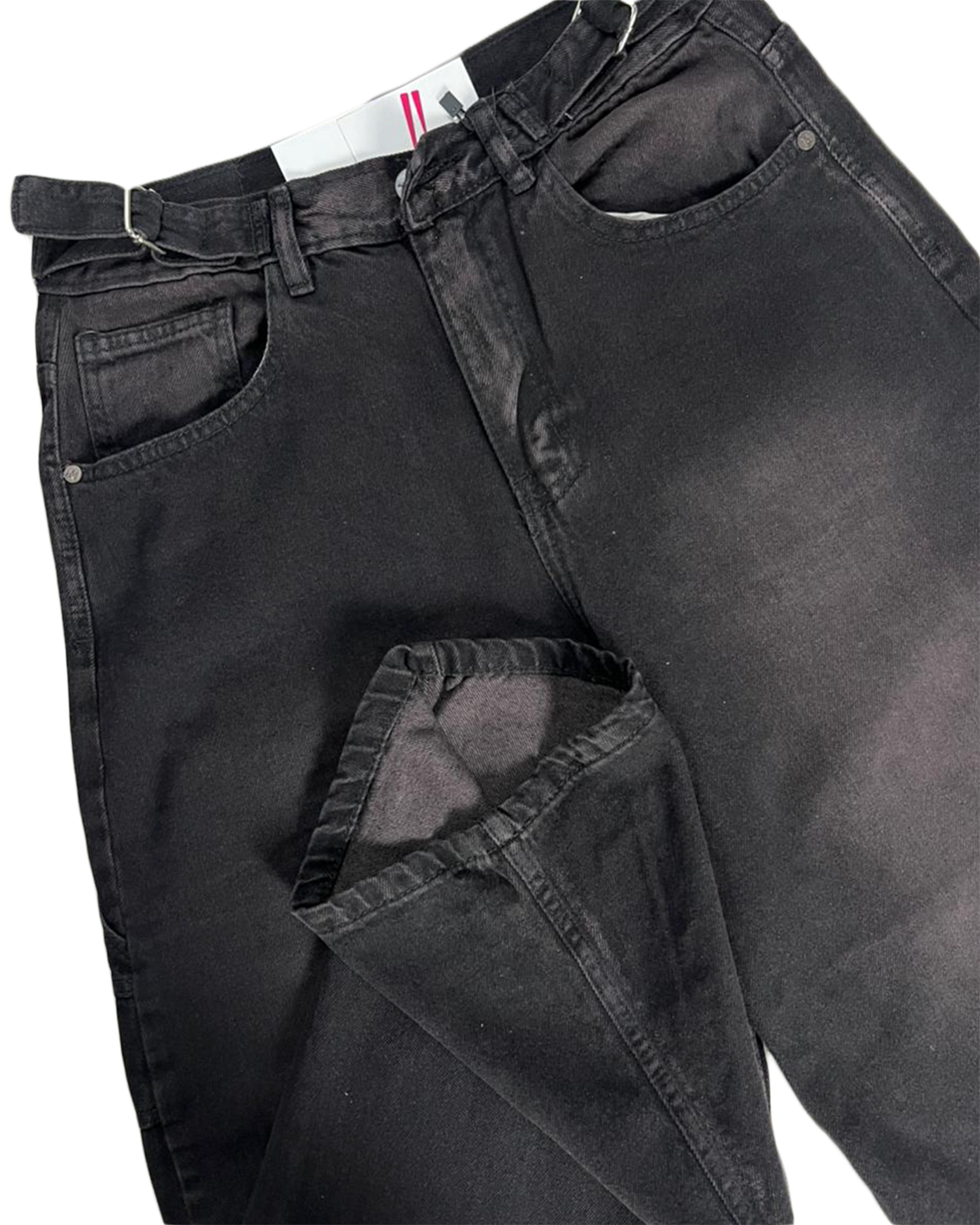 Jeans baggy unisex de denim rígido, color negro lavado, con hebillas ajustables en la cintura para un mejor calce. Cómodo, resistente y de estilo urbano.